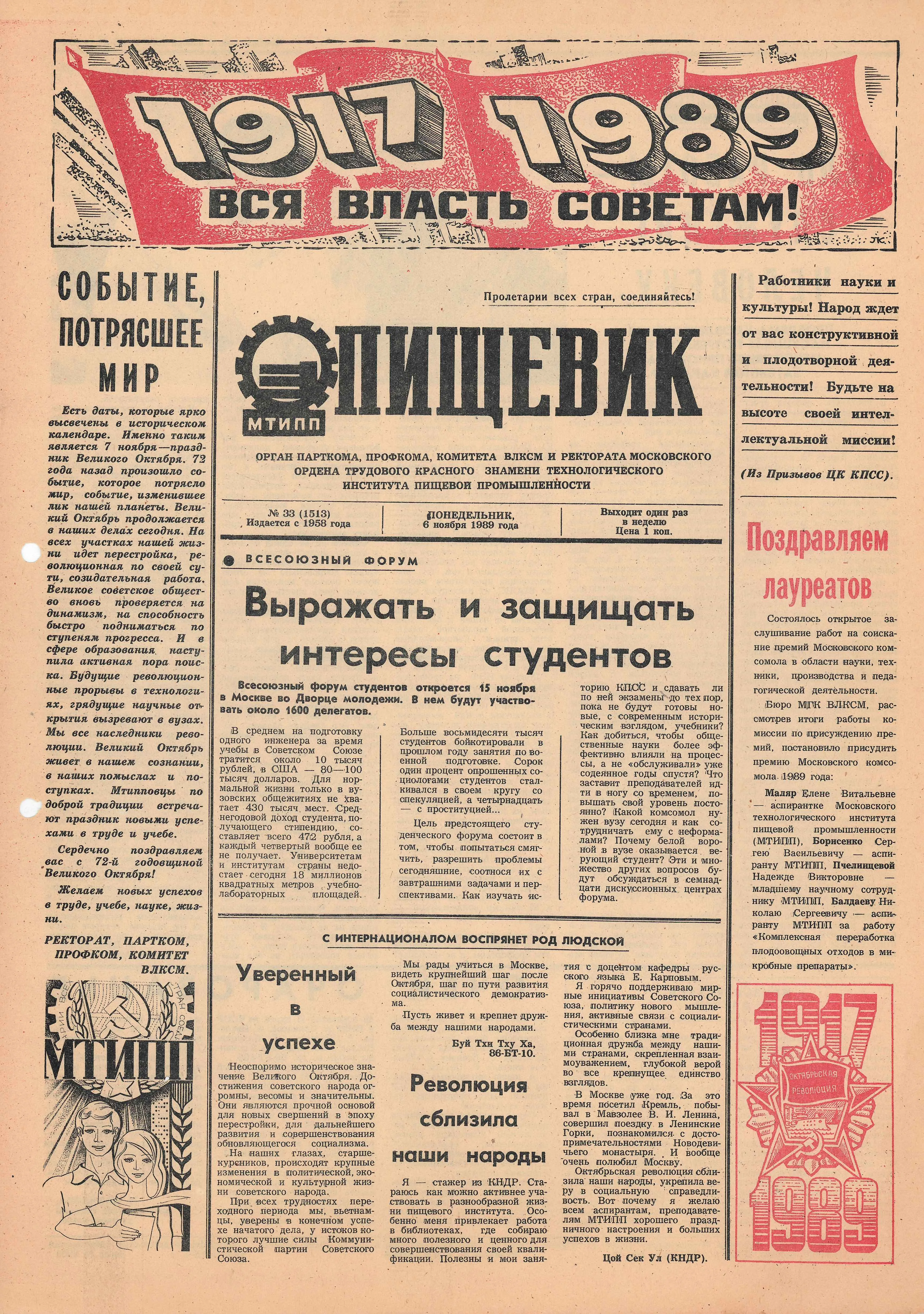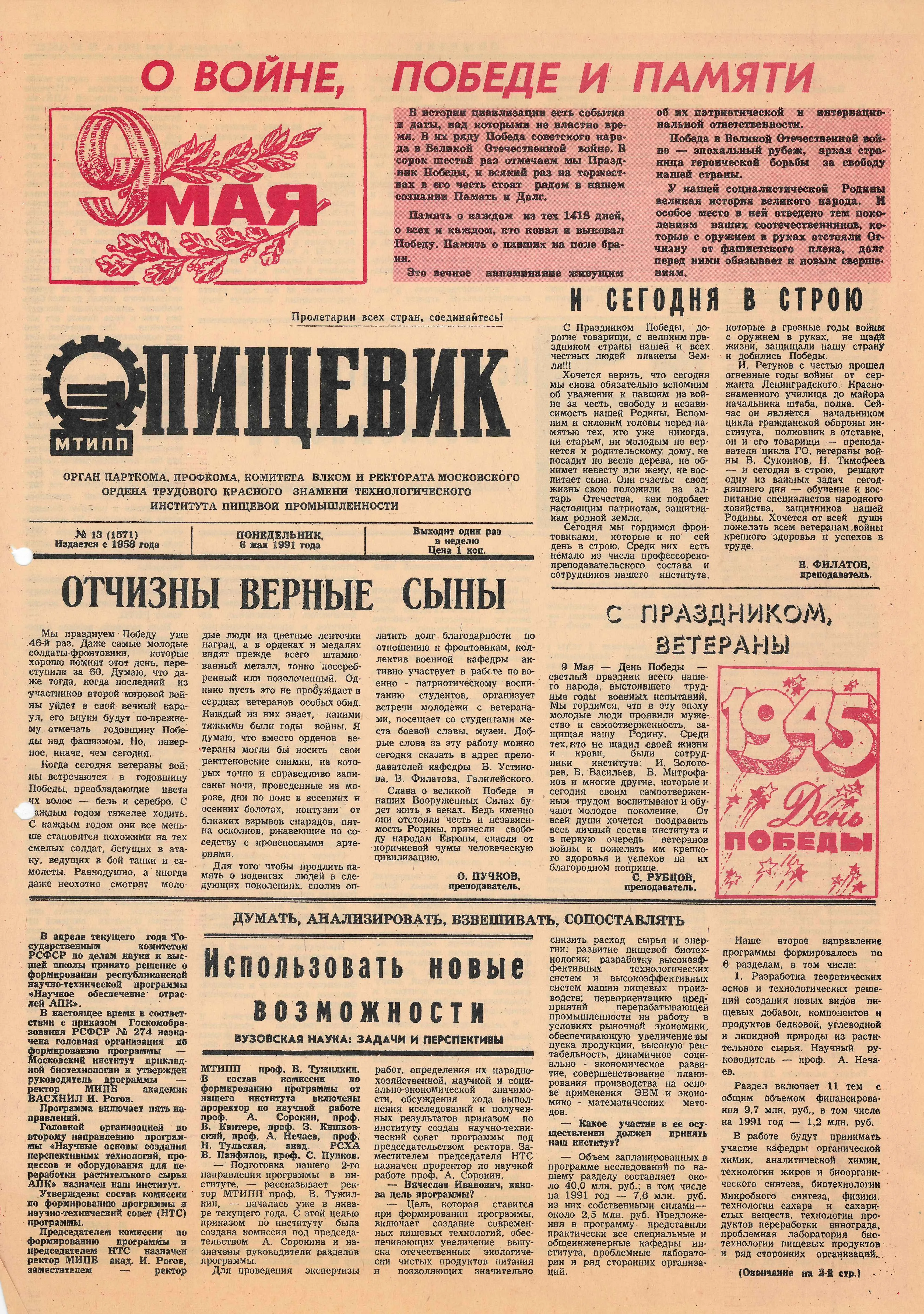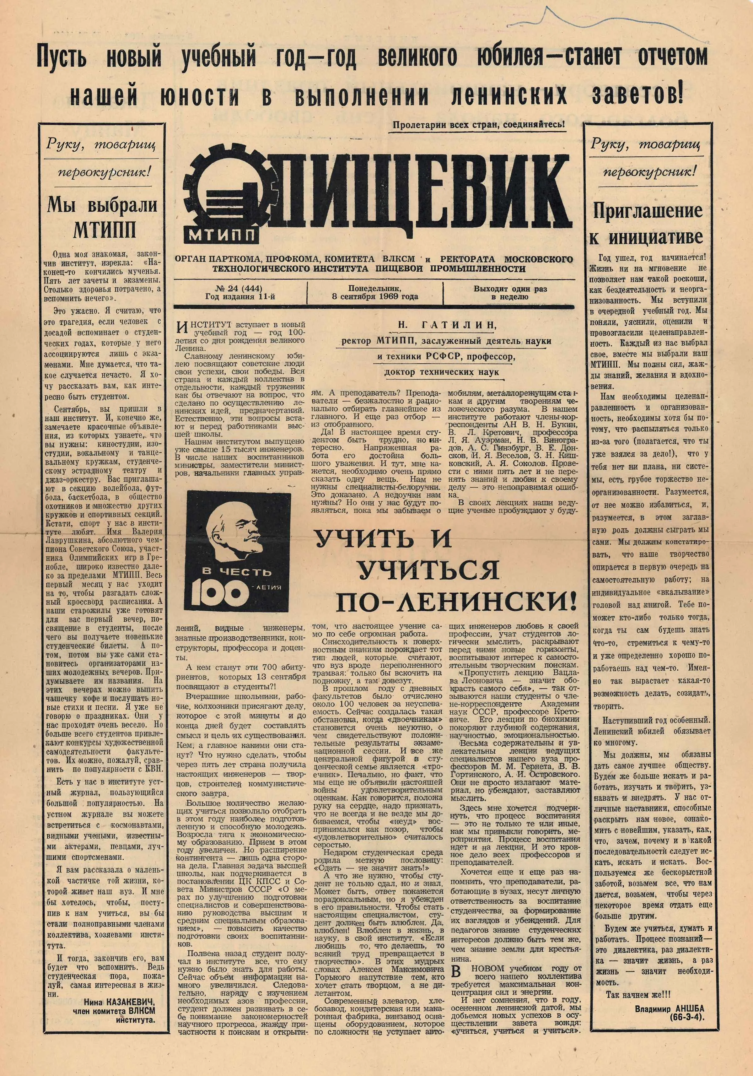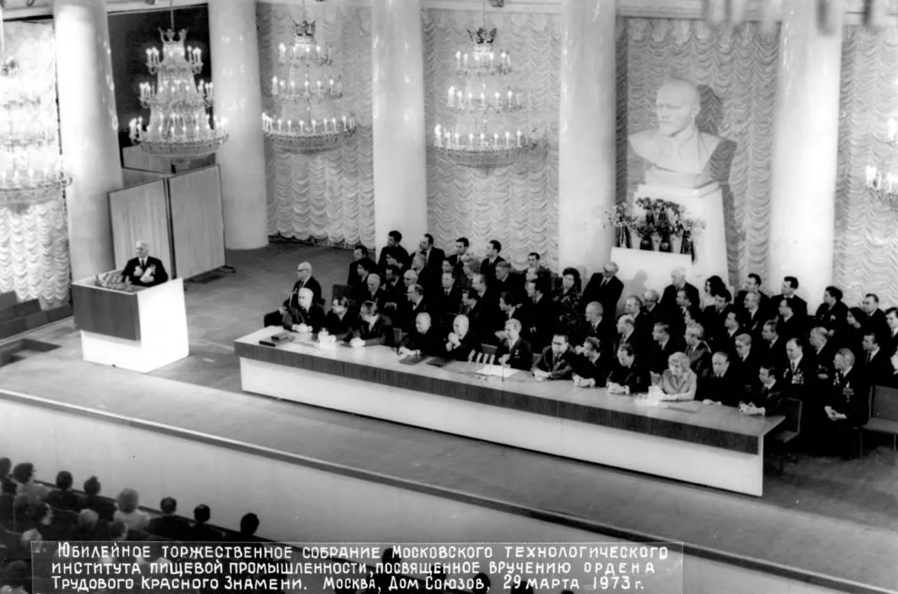 1945 г. Победа. Институт, пережив войну, становится ключевой площадкой для восстановления народного хозяйства. Выпускники МТИПП по комсомольским путевкам едут поднимать разрушенные хлебозаводы, мельницы, молочные комбинаты. В первые послевоенные годы вуз стремительно развивается: к концу 1940-х восстановлены довоенные лаборатории, открываются новые факультеты, растет прием студентов. Тогдаинститут возглавляли Л.А. Трисвятский (1944–1946)и В.Н. Стабников (1946–1951). В 1950-е МТИПП расширяет образовательные программы –добавляются специальности по консервированию и переработке сельскохозяйственного сырья, а также подготовка инженеров-электромехаников, инженеров по конструированию машин-автоматов и инженеров-технологов по технологии ферментных препаратов. В 1953 г.на базе отделения заочного обучения МТИПП создан Всесоюзный заочный институт пищевой промышленности. Это дало возможность тысячам людей из отдаленных регионов получить инженерное образование –еще одно свидетельство роли вуза как всесоюзной кузницы кадров.