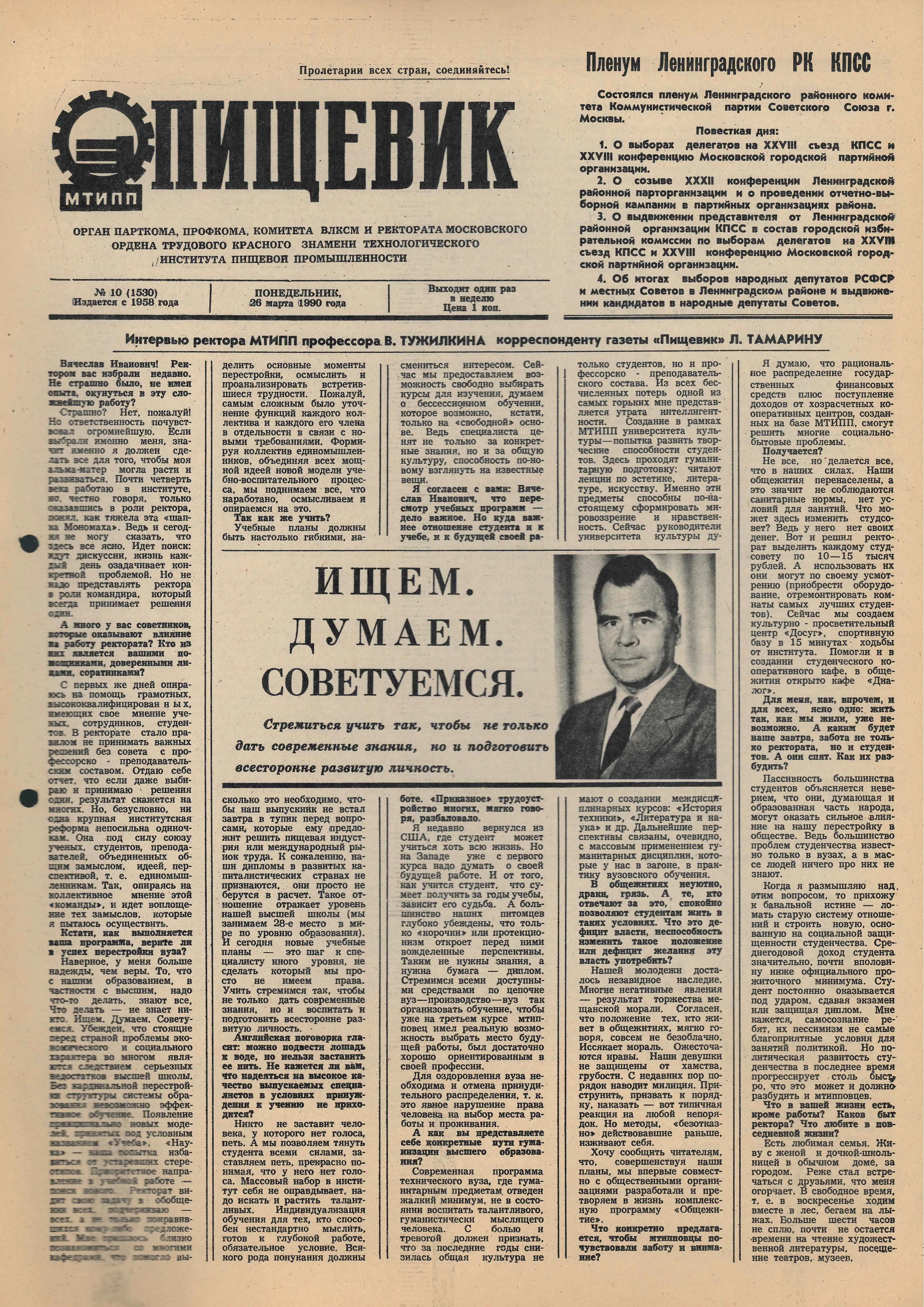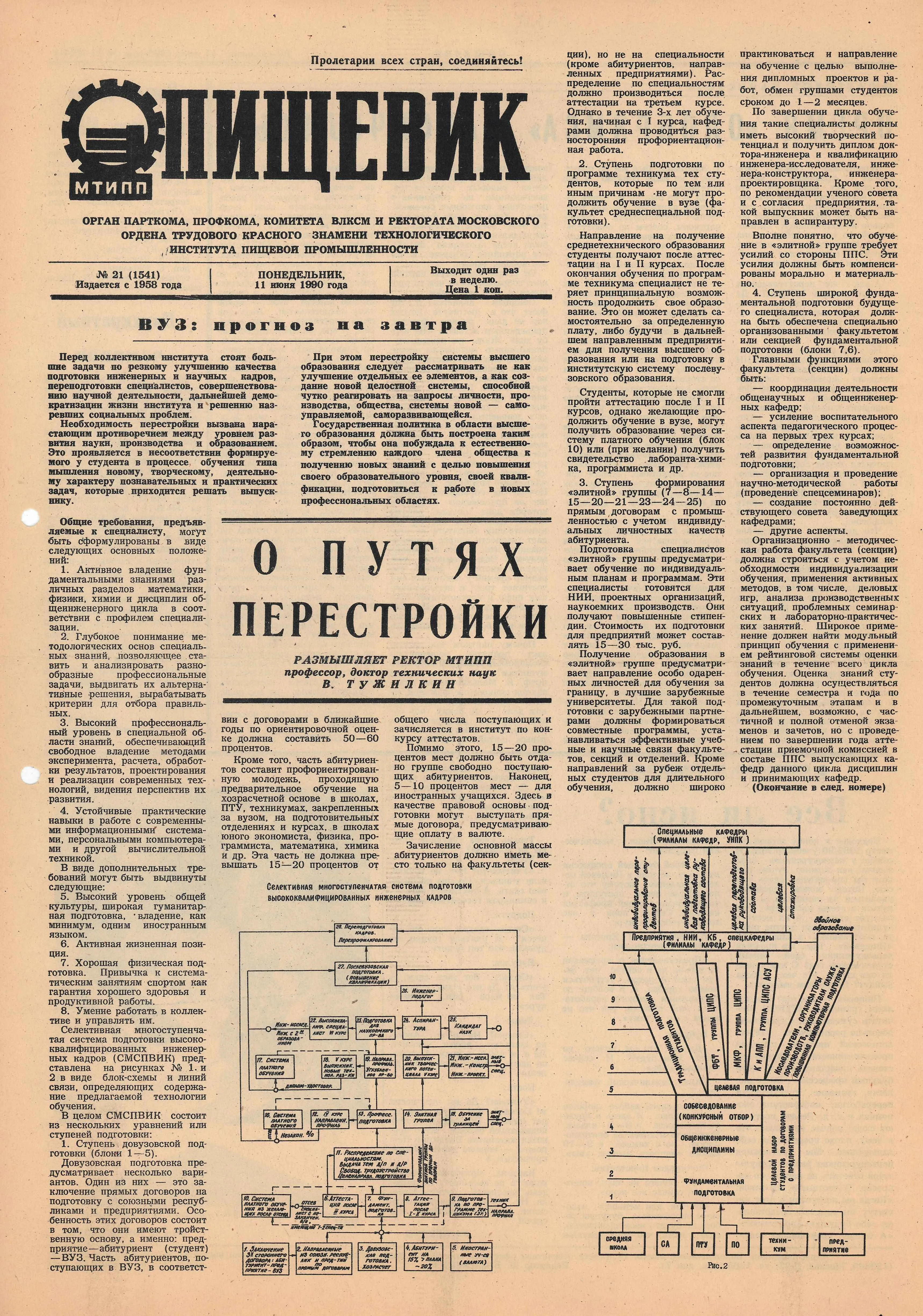 Конец 1980-х принес стране эпоху перестройки, а вузу — нового руководителя. В 1989 г. ректором стал В.И. Тужилкин, возглавлявший институт почти два десятилетия (1989–2007). Ему выпало руководить и в последние годы СССР, и в сложный период становления новой экономики России. Вячеслав Иванович — заслуженный деятель науки и техники РФ, лауреат Премии Совета Министров СССР. Награжден орденом «Знак Почета», Золотой медалью «За личные заслуги в развитии технологий и продуктов здорового питания» и двумя медалями, нагрудным знаком «Почетный работник высшего образования России», Почетной грамотой Министерства образования и науки Российской Федерации, Почетной грамотой Госкомвуза РФ.