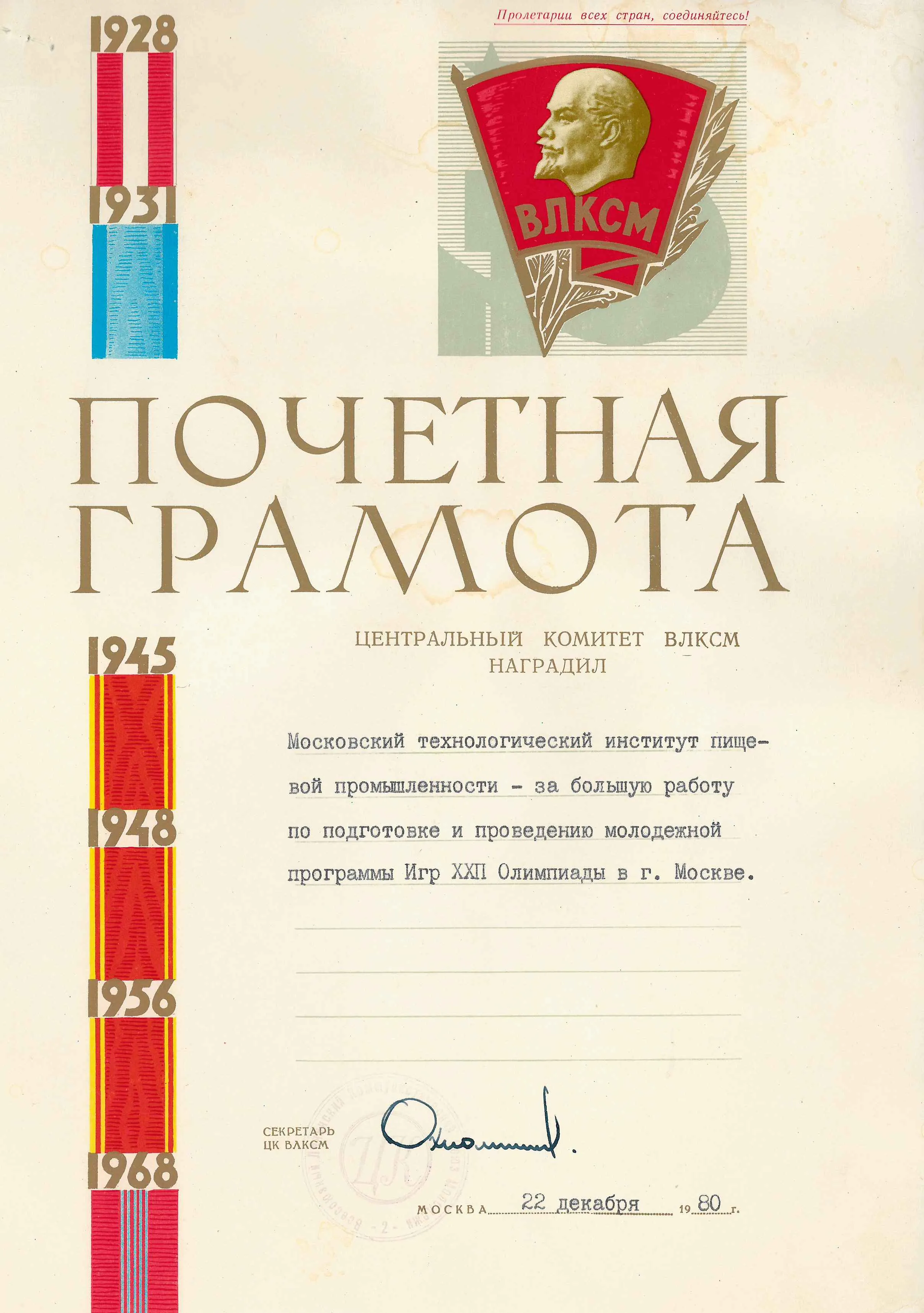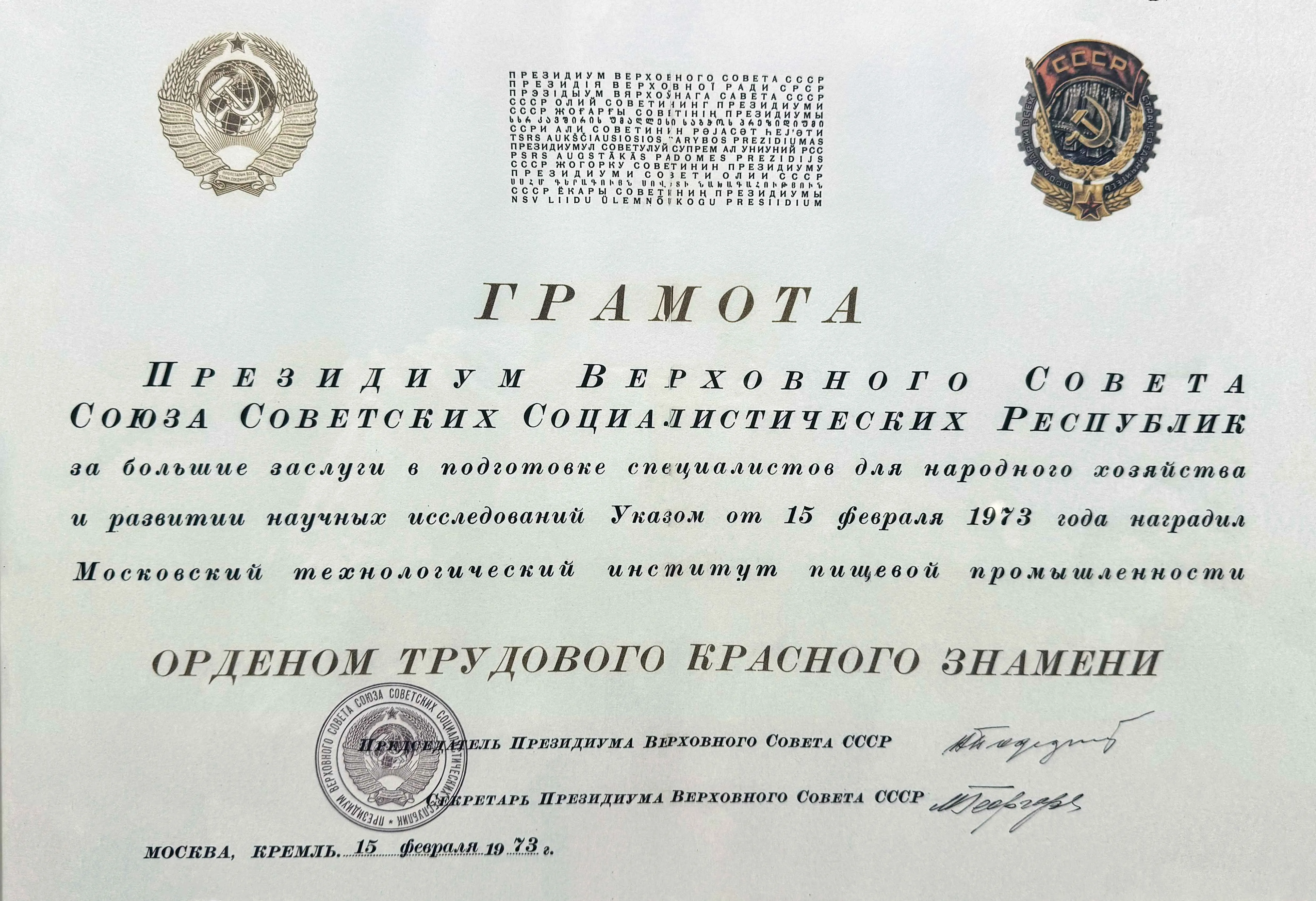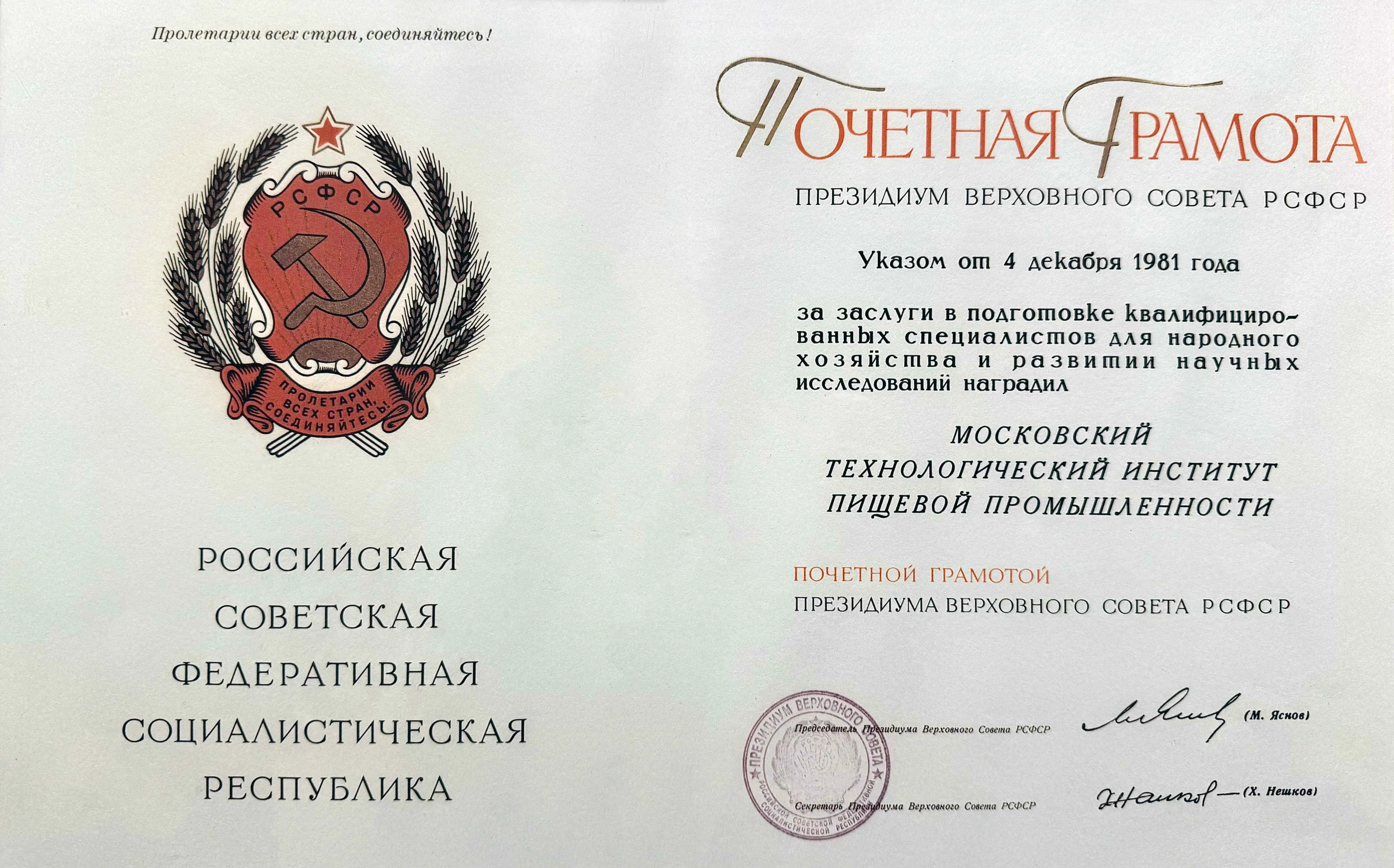 В 1973 г. МТИПП был удостоен ордена Трудового Красного Знамени, а в 1981 г. — Почетной грамоты Президиума Верховного Совета РСФСР за большие заслуги в подготовке специалистов и развитие научных исследований. В 1980 г. коллектив института был отмечен за участие в продовольственном обеспечении мероприятий Московской Олимпиады — вклад инженерной школы МТИПП в задачи города и отрасли получил официальное признание.